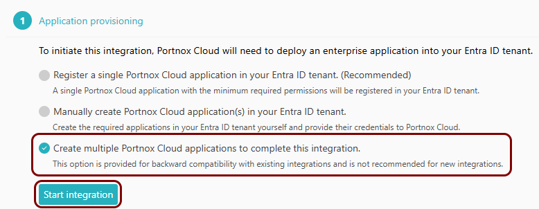 Important:If you prefer to use the recommended single-application option, skip the above step and instead go to the following topic: Integrate with Microsoft Entra ID. If you prefer to integrate manually to have granular control over application privileges in your Entra ID environment, go to the following topic: Integrate with Entra ID using manual provisioning.Warning:Wait for the Microsoft web servers to display the results of each step of the integration before you proceed further. Do not hurry. Otherwise, the integration process may fail and you will need to start it from scratch. -