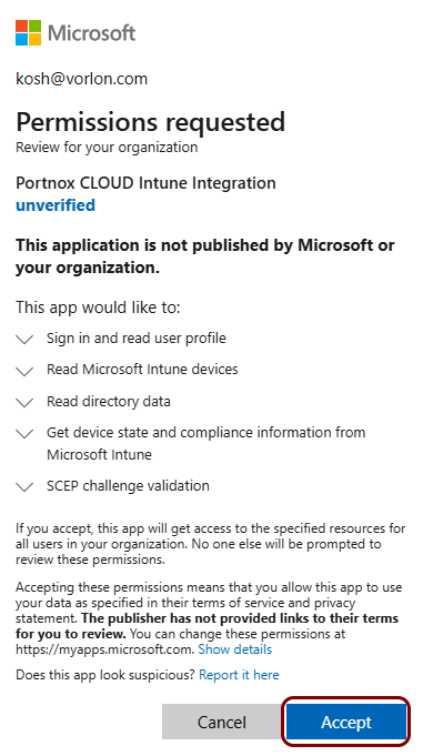 3. Click on the Accept button to confirm permissions that the Portnox Cloud integration application will have to your Intune data.