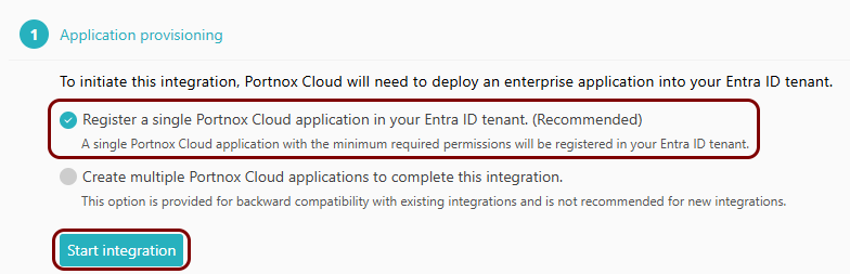 4. In the Application provisioning step, select the following option: Register a single Portnox Cloud application in your Entra ID tenant. Then, click on the Start integration button.