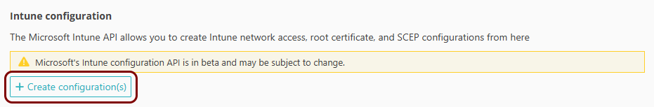 1. Click on the Create configuration(s) button in the Intune configuration section, which is located at the end of the MS Intune integration service section.
