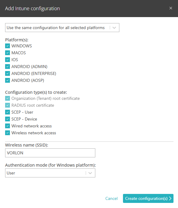 2. In the Add Intune configuration window, select the Platform(s) and Configuration type(s) to create: