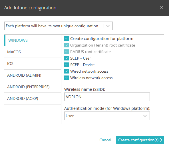 3. If instead of the default option: Use the same configuration for all selected platforms, you chose the option: Each Platform will have its own unique configuration, you can then choose different configuration types for each platform (including different SSIDs and authentication modes).