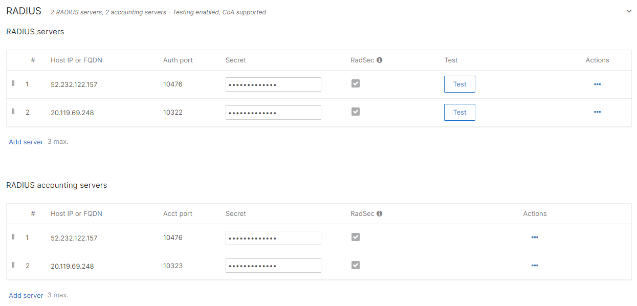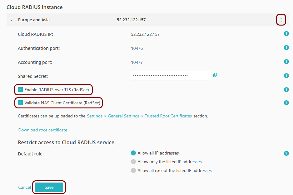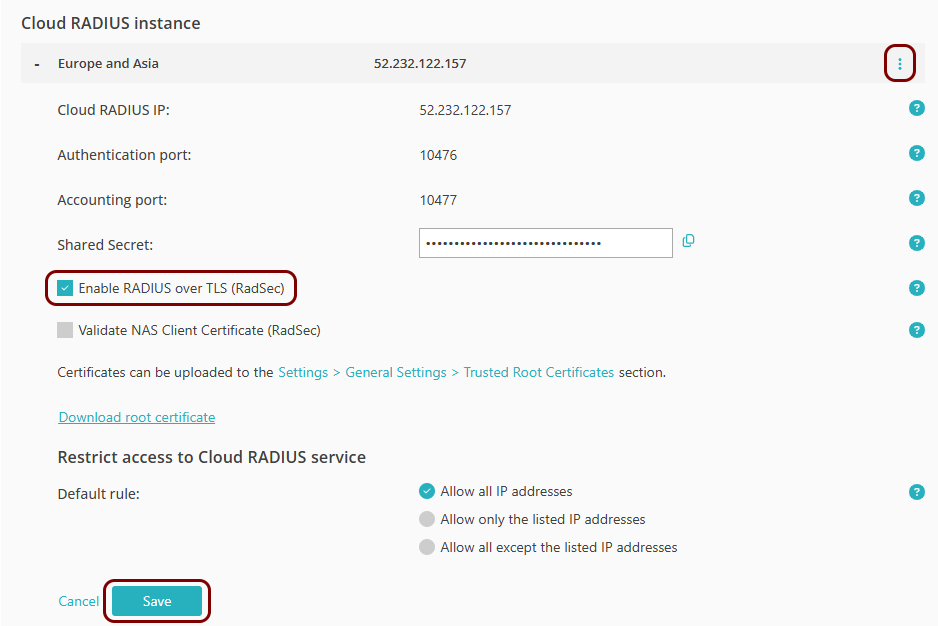 United States and North America), click on ⋮ > Edit, and activate the Enable RADIUS over TLS (RadSec) checkbox and the V