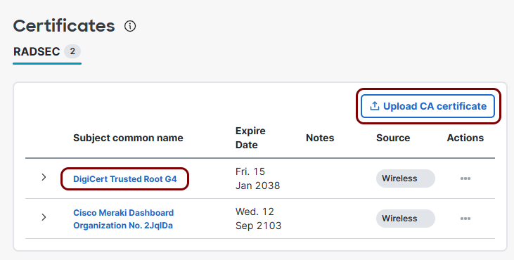 In the Meraki web interface, go to Organization > Certificates. Then, in the RADSEC tab, click on the Upload CA