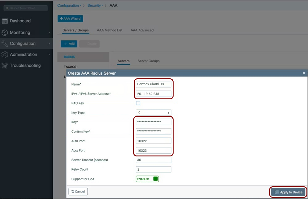 Create Cloud RADIUS servers and note down the following values: Cloud RADIUS IP, Authentication port, Accounting port, and Shared Secret.