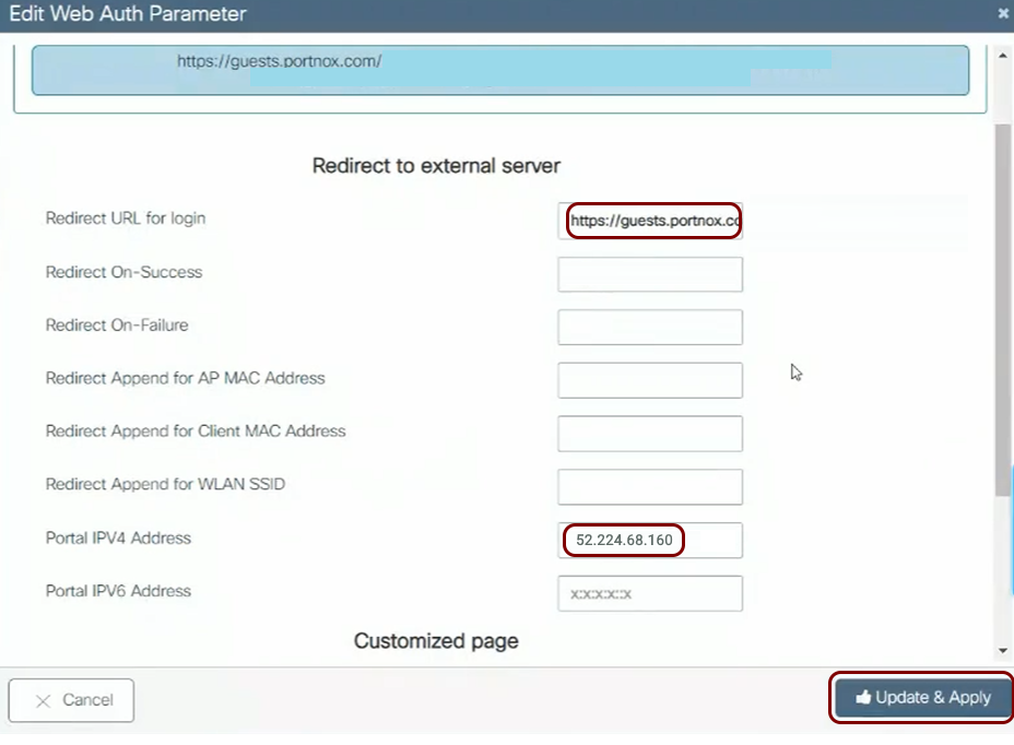 Configure the guest network in Portnox Cloud and note down the values of the fields: IP (for walled garden) and Captive Portal URL.