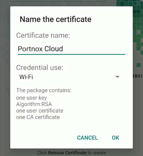 2. In the Name the certificate pop-up, enter a readable name for the certificate. In the Credential use field, select the Wi-Fi option, and press the OK button to install the certificate.
