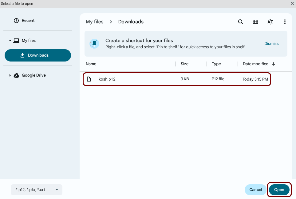 In the Select a file to open window, select the downloaded certificate file, and then click on
