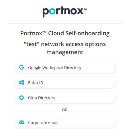 Note: The buttons available on this page will depend on the authentication repositories integrated with your Portnox Cloud. It is very likely that your organization will only use one of them. The Corporate email option is available only if you configured the self-onboarding portal to allow end-users to use and create Portnox accounts using the self-onboarding portal.