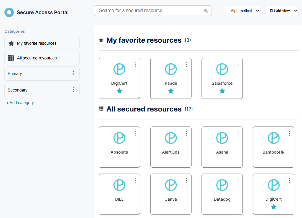 After signing in, users see a set of tiles that represent all configured ZTNA resources, including SSO web applications and hosted resources. Selecting a tile opens the corresponding resource. Users can also select the ⋮ icon to Add to favorites or Add to category, allowing them to organize resources for easier access. Favorites and categories are stored per user.